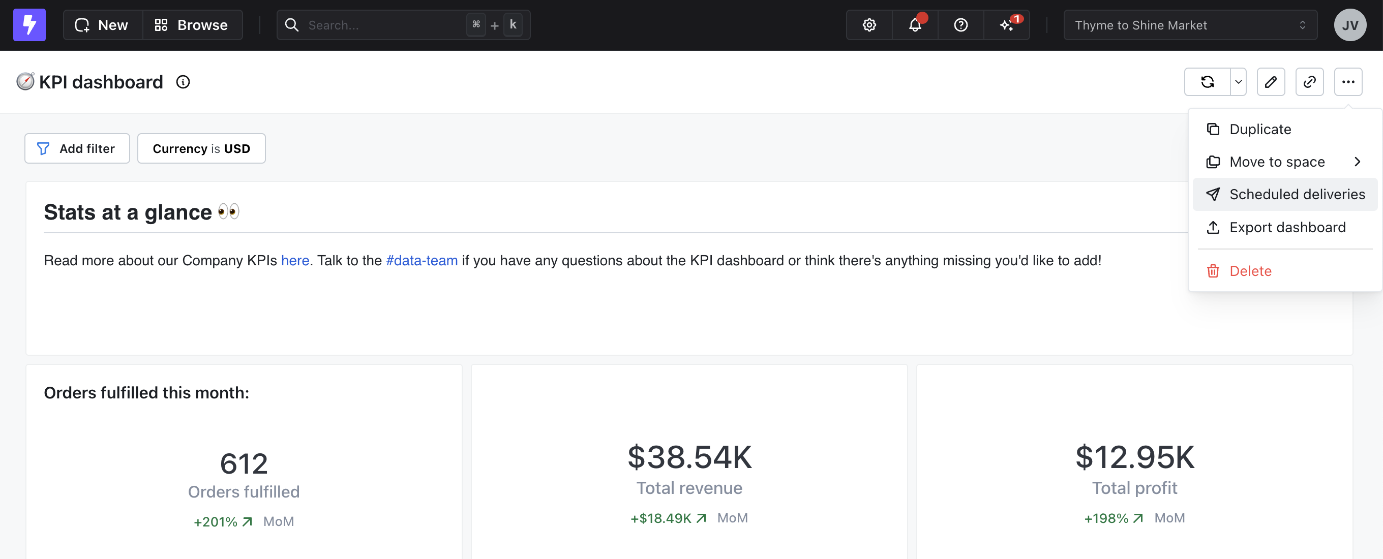 To create a scheduled delivery, click on the three-dot menu in the top-right corner of your chart or dashboard, then click on scheduled deliveries.