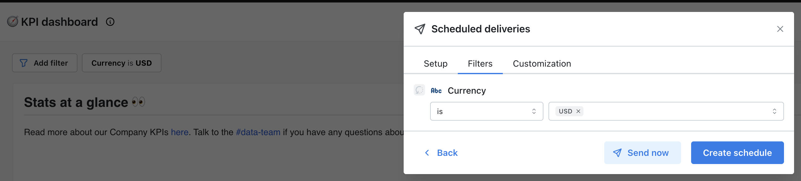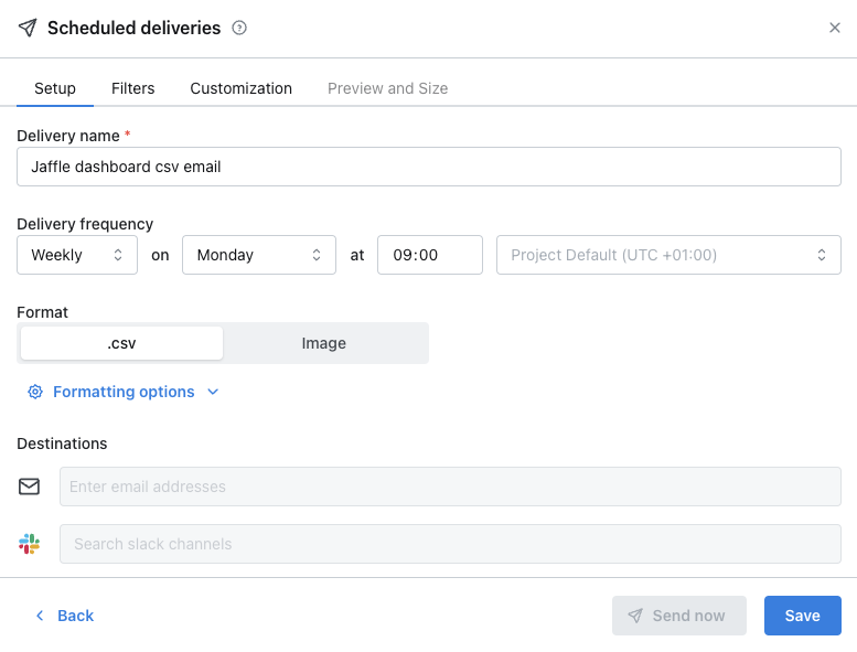 You can choose if you want to send your scheduled delivery to Slack, email, or both. You can add as many Slack channels and email addresses as you’d like to here. You can send a scheduled delivery to a person in Slack using @persons-name or to a channel using #channel-name.