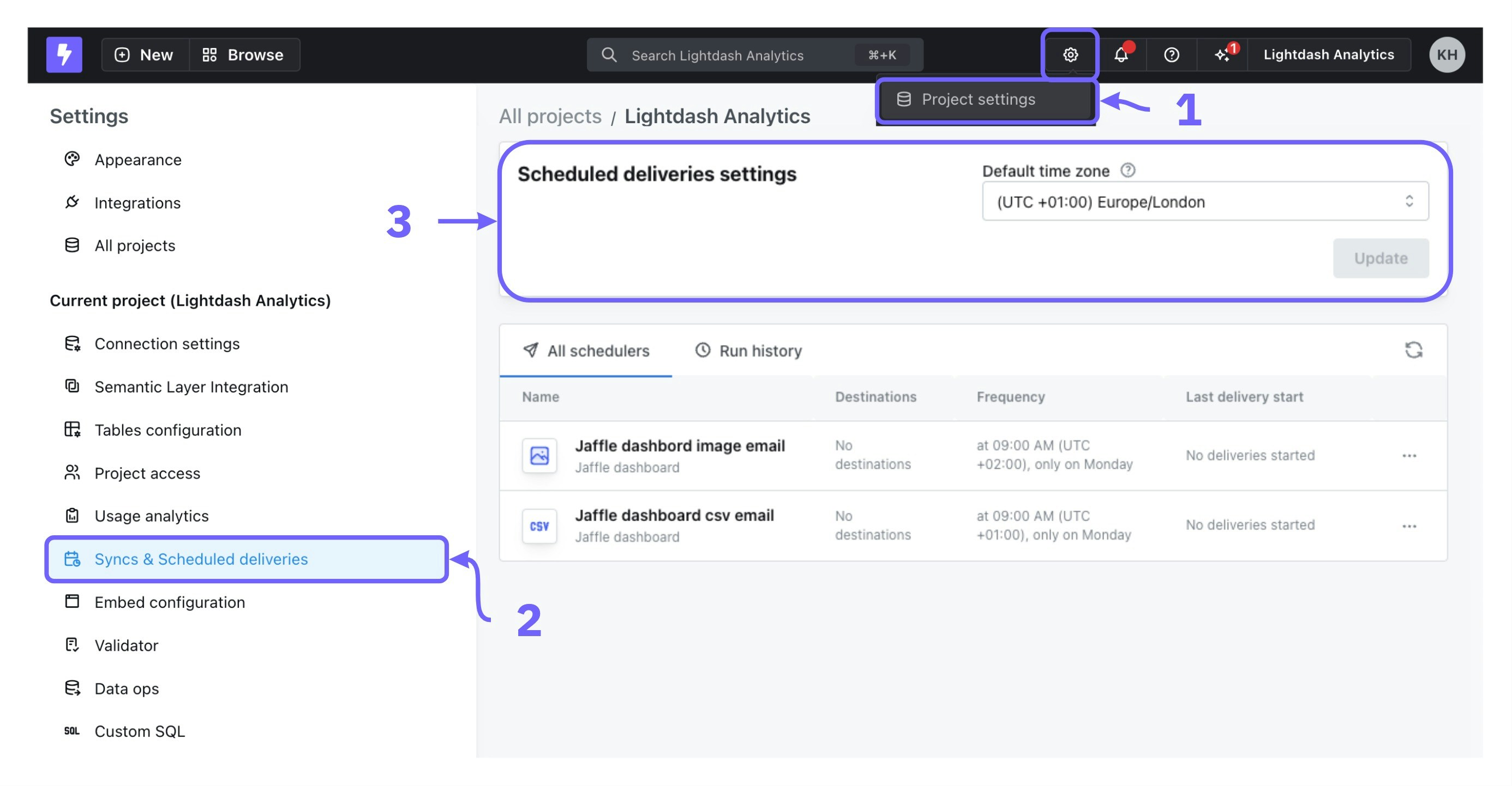 Project admins can set the default time zone used for scheduled deliveries across the project in the Project settings —> Syncs & Scheduled deliveries.