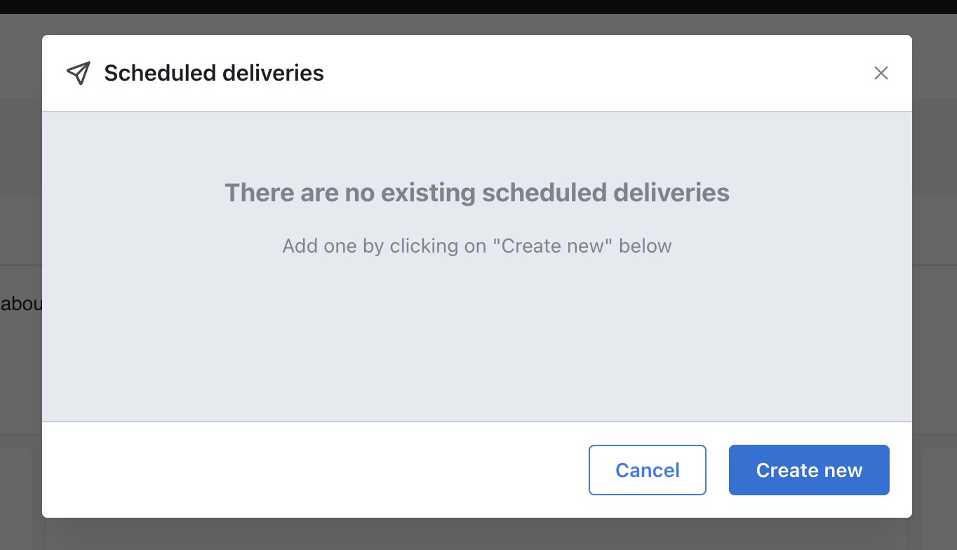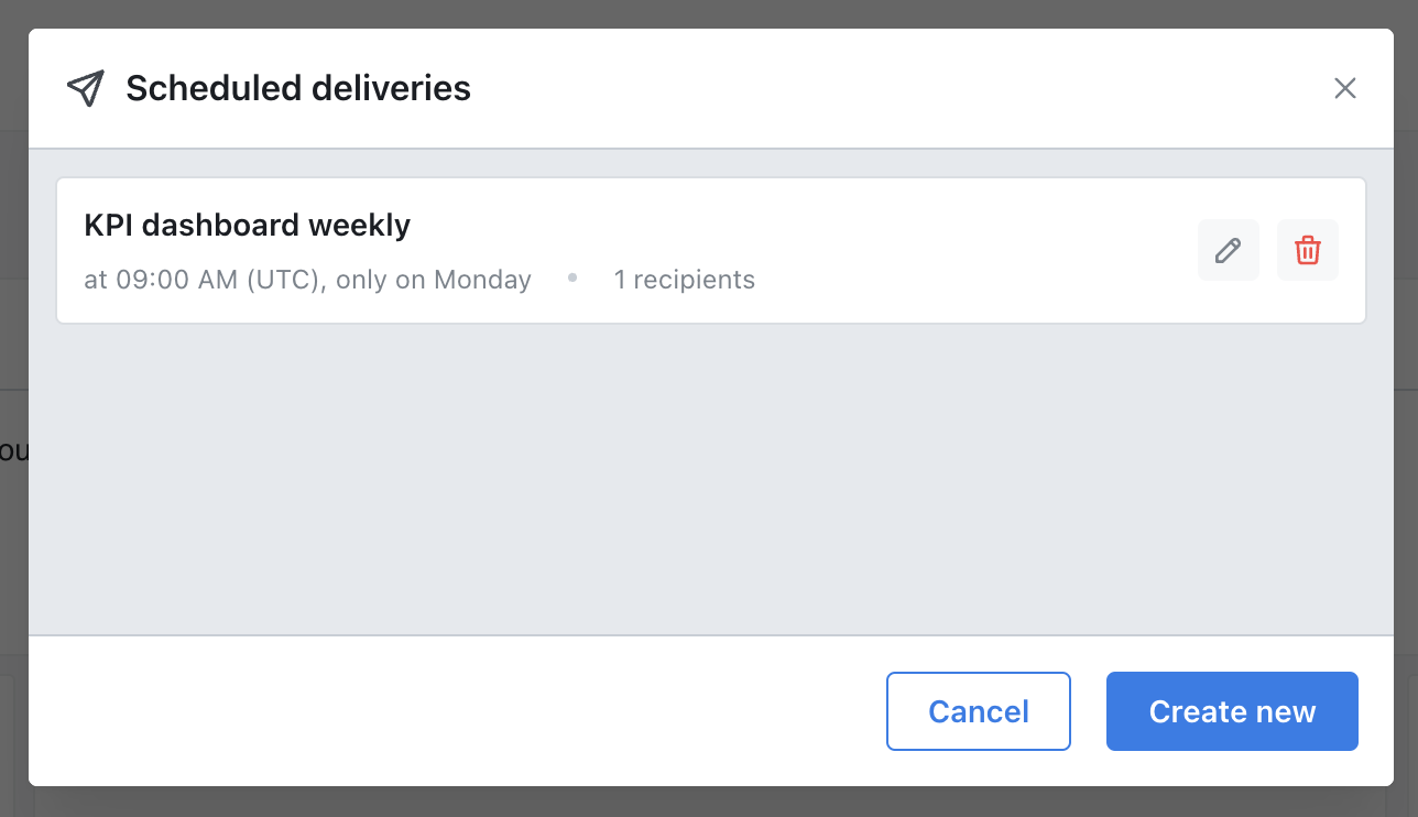 You’ll get a modal that pops up and shows you the list of existing scheduled deliveries for your saved chart or dashboard, and gives you the option to create new.