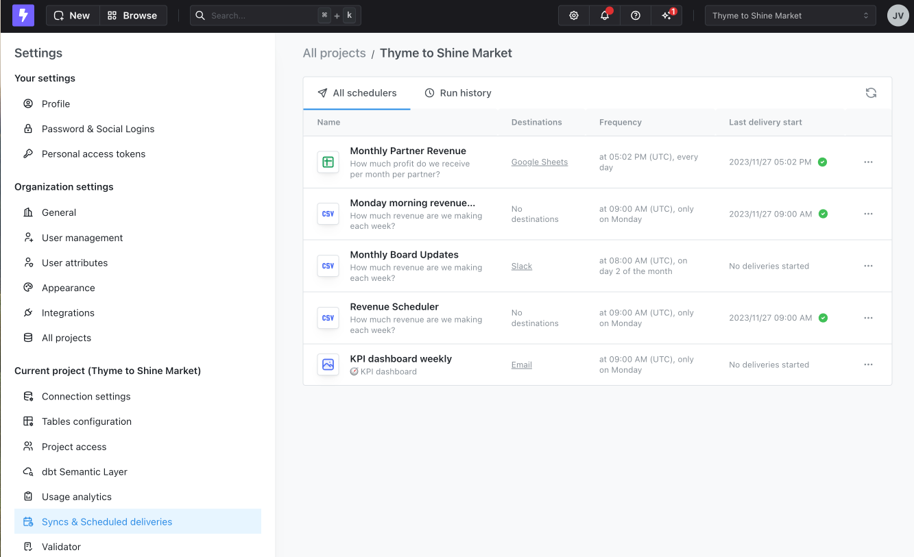Users who have an admin role in your project can access an overview of your scheduled deliveries in the project settings. In the scheduled deliveries overview page, you can see a list of all of your scheduled deliveries, their most recent delivery status, and a history of all of the previous scheduled deliveries in your project. To access the overview page, just head to your project settings, then to the Syncs & Scheduled Deliveries tab.