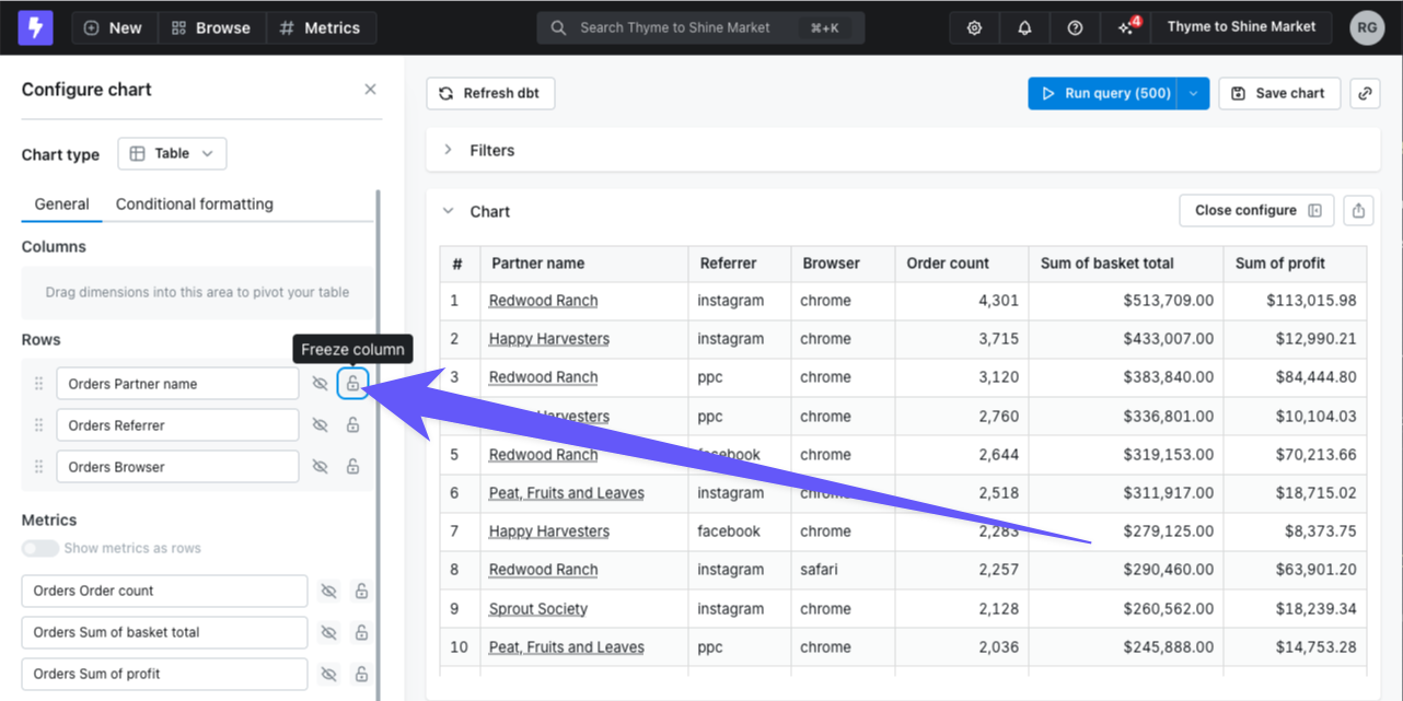 If you have a wide table, you may want some columns to be locked to the left while you’re scrolling. Click on the lock icon beside the column(s) you want to keep pinned to the left of your table visualization to lock them in place.