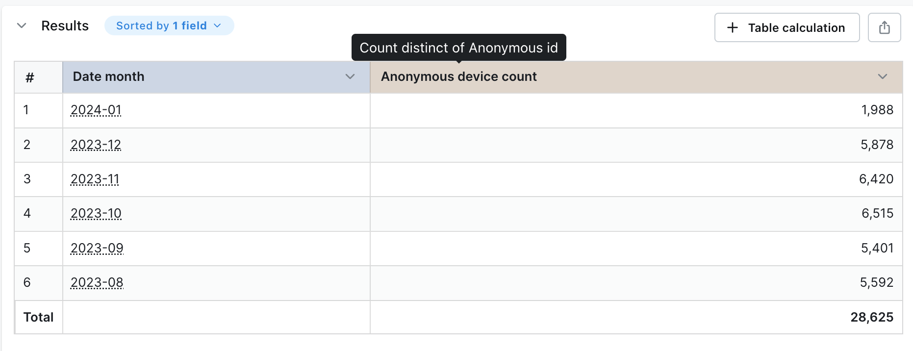 If you manually add each row in the Anonymous device count column, the value you get is much higher than the total shown in the table. This is because the same device can view pages on our website across many months. So, when you add up the values in the table, you’ll be counting some devices more than once. Lightdash uses a SQL query to calculate the distinct number of devices across all of the months so we avoid double-counting devices. Why are my totals higher? There are two reasons why this could be happening: