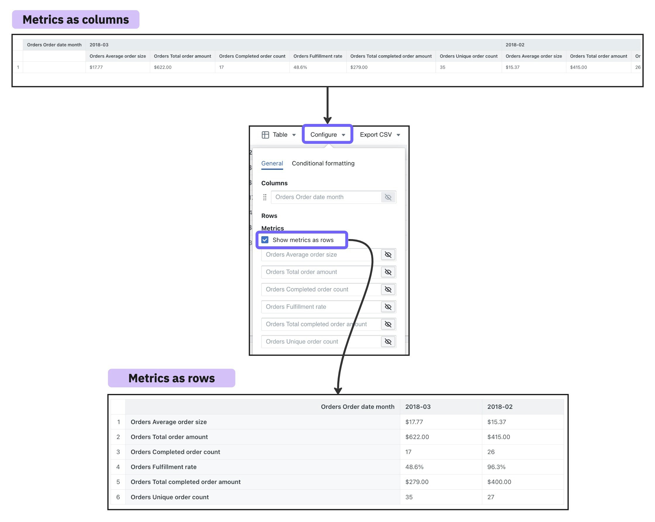 You can transpose your table so that your metrics become rows in your table instead of columns. This can be helpful if you want to compare a lot of metrics to each other (e.g. how my metrics are changing over time). To move your metrics to rows in your table, you need to have at least 1 dimension as a column (i.e. at least one pivot) then, you can click on show metrics as rows in the table configuration.