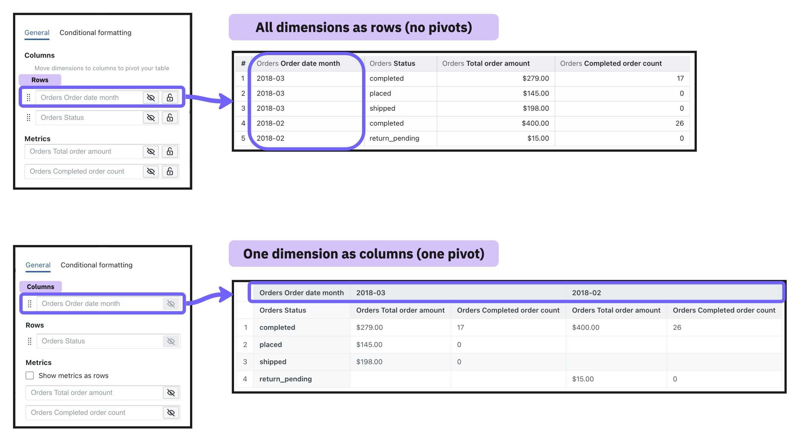 Pivot tables allow you to summarize larger sets of data in table visualizations by moving row values into columns. They’re also helpful to identify trends between two dimensions in your data using a table visualization. To add a pivot in your table, move a dimension to the column section of your table configuration. This will change the dimension from having its values populate the rows values of your table, to having it populate the column values of your table.