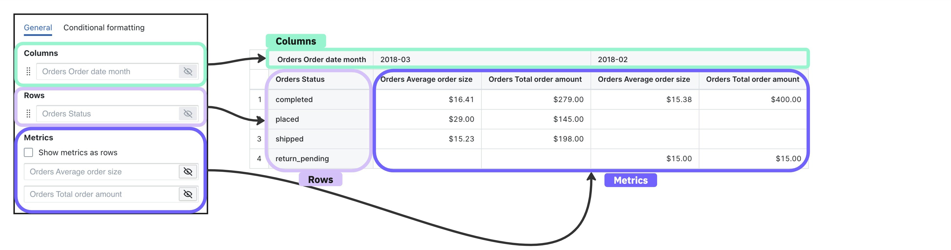 Columns, rows, and metrics