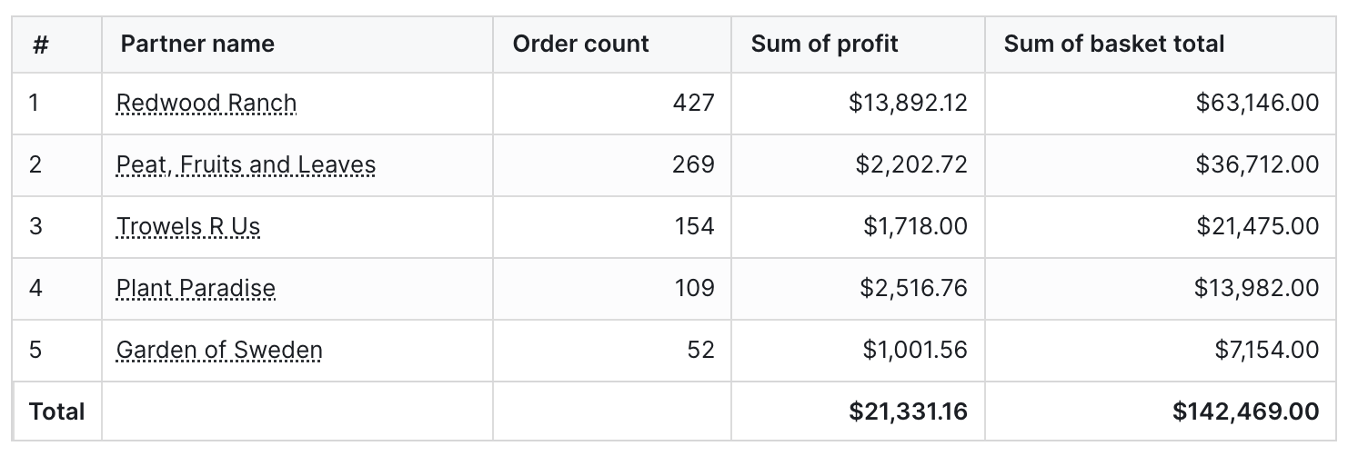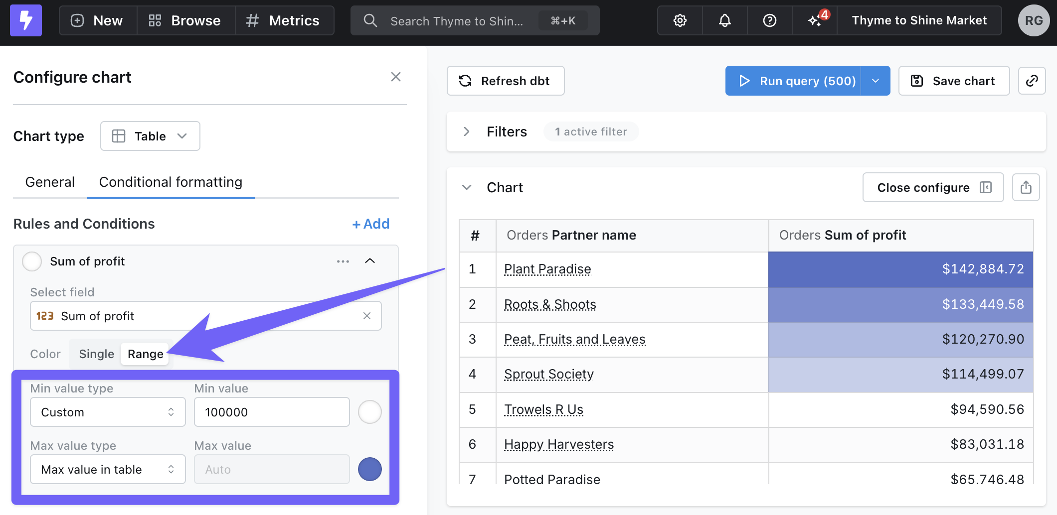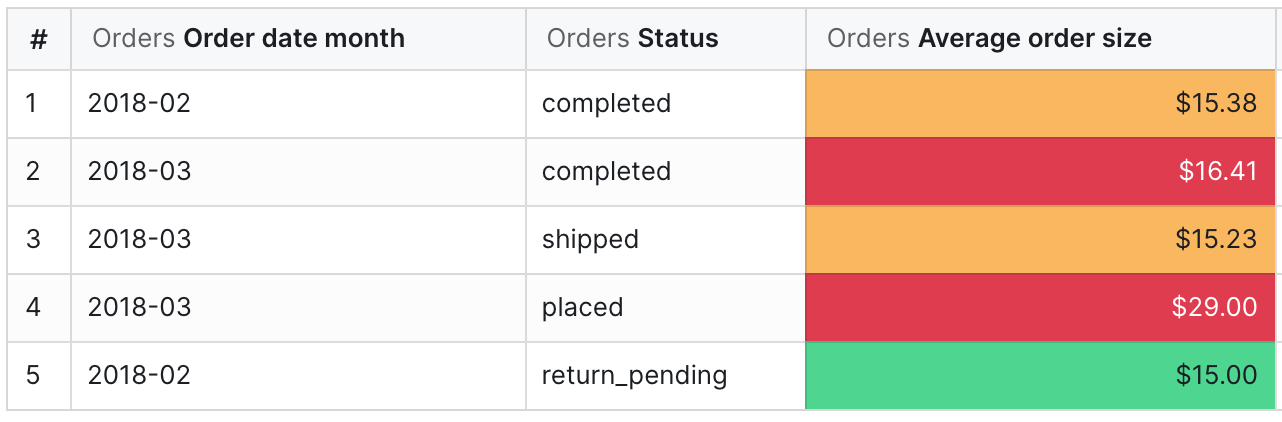 • For example, color the Partner name column orange when the Total orders column is greater than 1,000.
