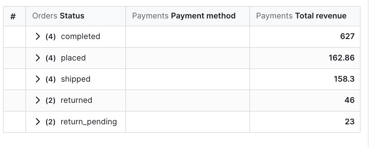 • Metrics: If you have metrics in your table, then each metric cell shows the summarized information for a given row + column combination.