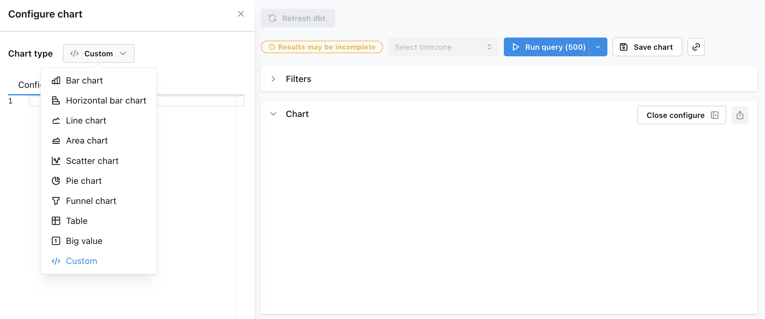 Below are some example chart config templates that we got working in Lightdash, along with some tips on when to use each chart type.